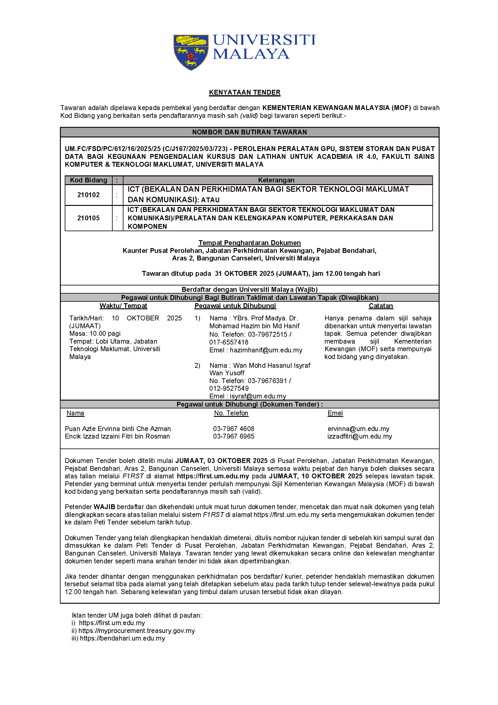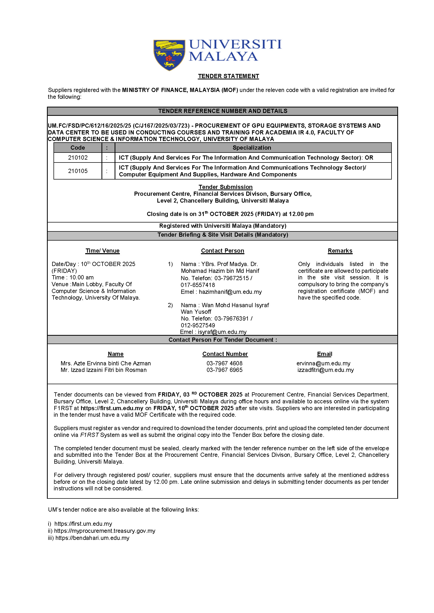 UM.FC/FSD/PC/612/16/2025/25 (C/J167/2025/03/723) - PROCUREMENT OF GPU EQUIPMENTS, STORAGE SYSTEMS AND DATA CENTER TO BE USED IN CONDUCTING COURSES AND TRAINING FOR ACADEMIA IR 4.0, FACULTY OF COMPUTER SCIENCE & INFORMATION TECHNOLOGY, UNIVERSITY OF MALAYA