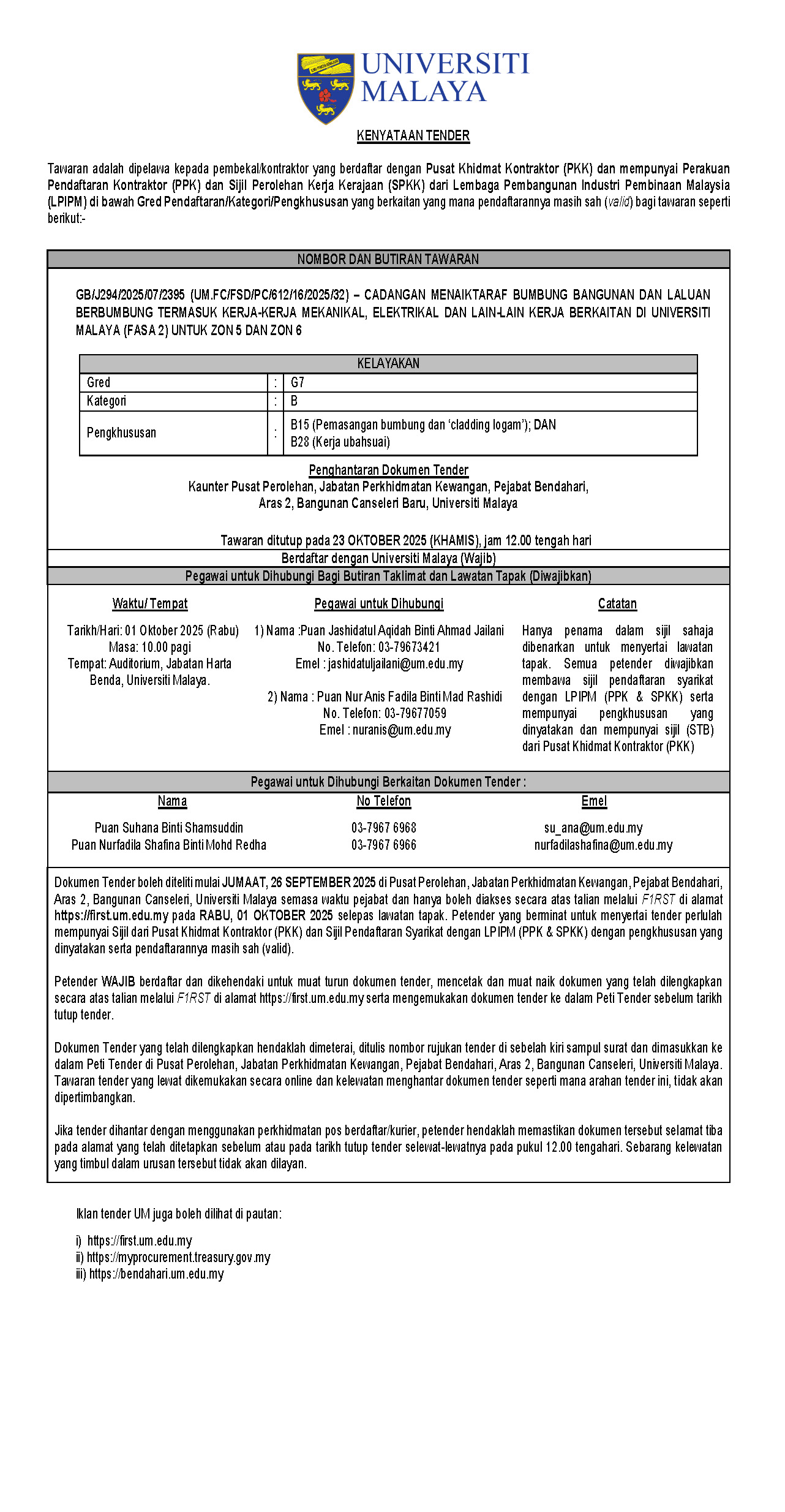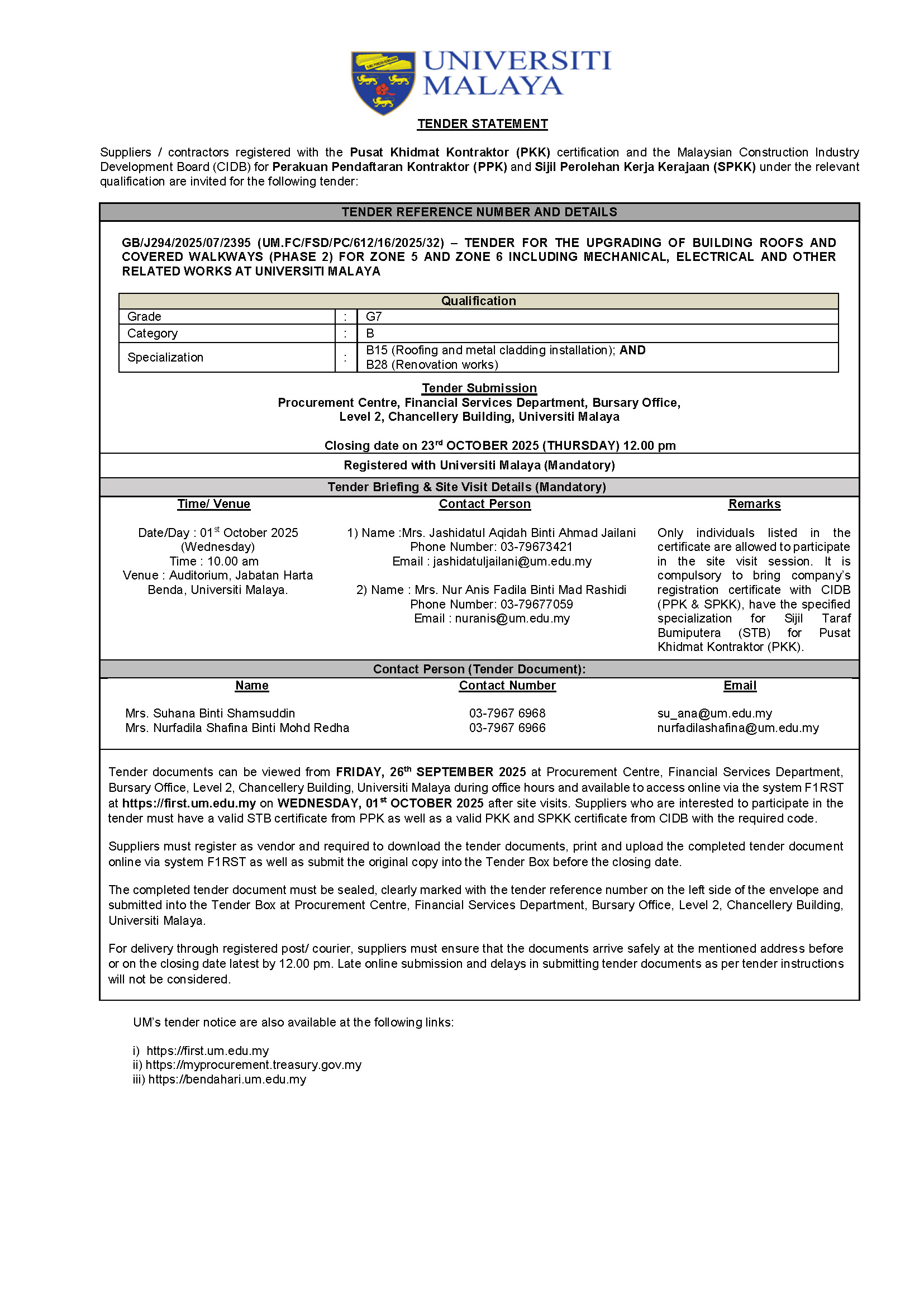 TENDER FOR THE UPGRADING OF BUILDING ROOFS AND COVERED WALKWAYS (PHASE 2) FOR ZONE 5 AND ZONE 6 INCLUDING MECHANICAL, ELECTRICAL AND OTHER RELATED WORKS AT UM