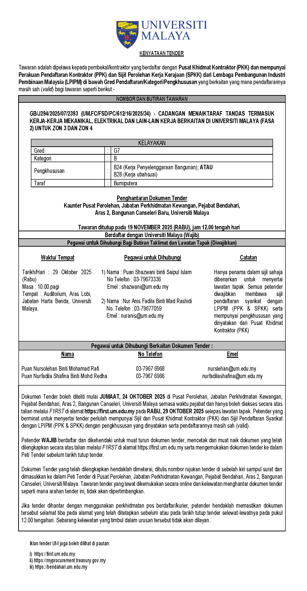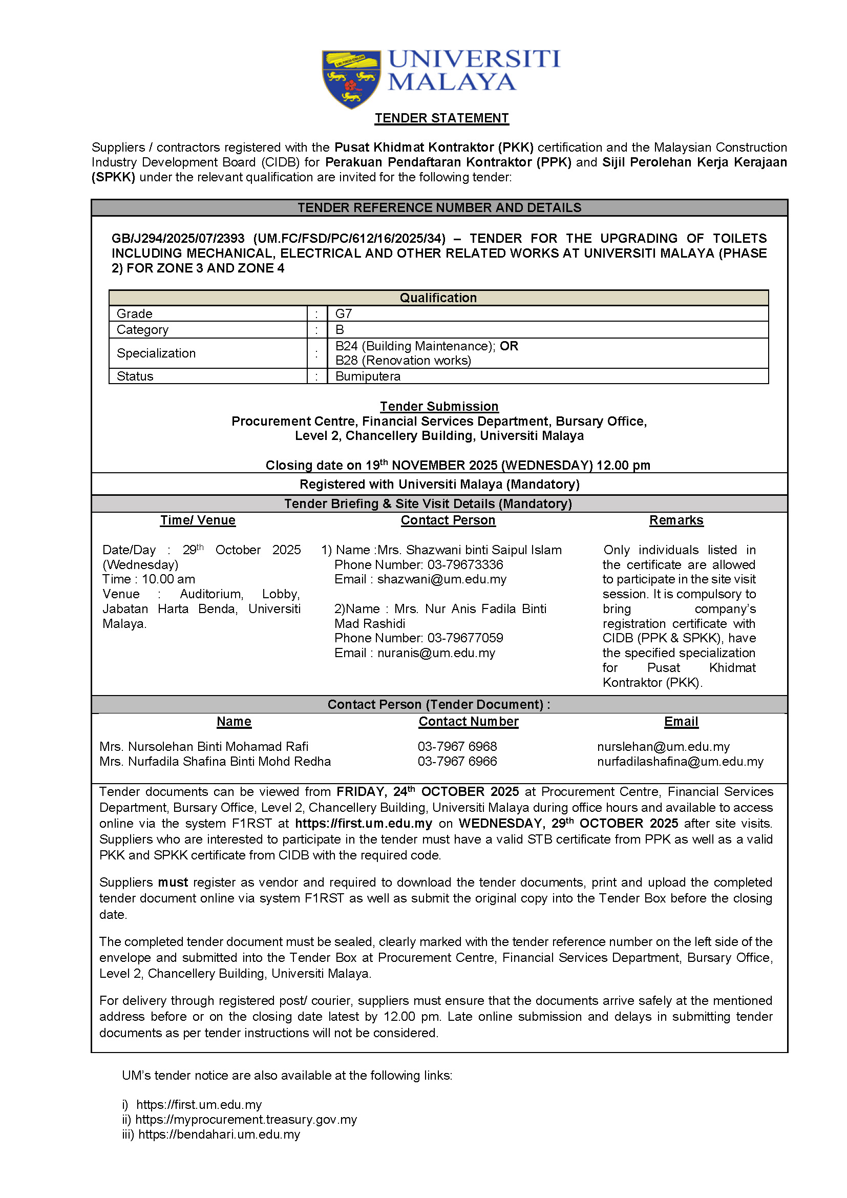 GB/J294/2025/07/2393 (UM.FC/FSD/PC/612/16/2025/34) – TENDER FOR THE UPGRADING OF TOILETS INCLUDING MECHANICAL, ELECTRICAL AND OTHER RELATED WORKS AT UNIVERSITI MALAYA (PHASE 2)FOR ZONE 3 AND ZONE 4