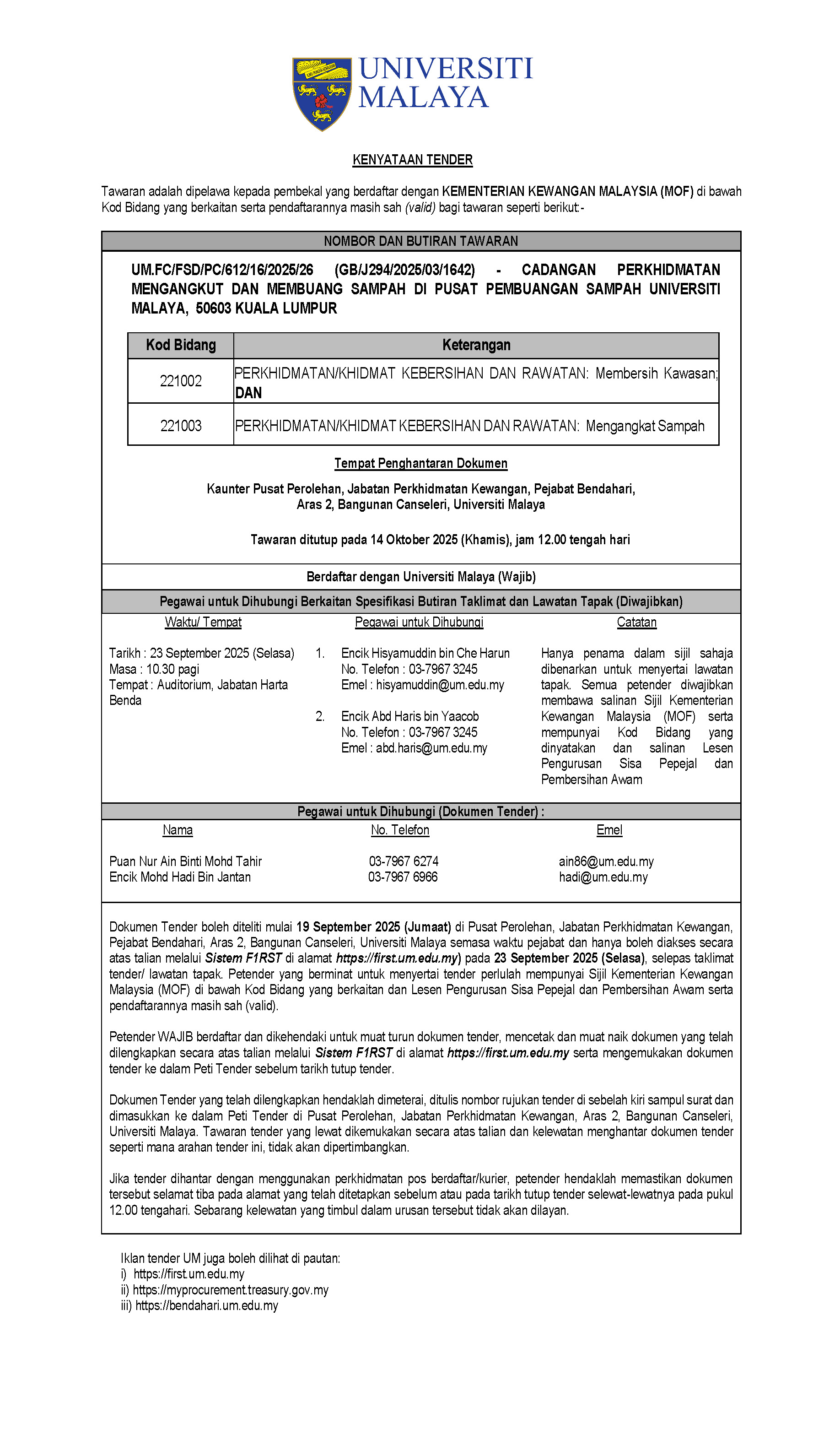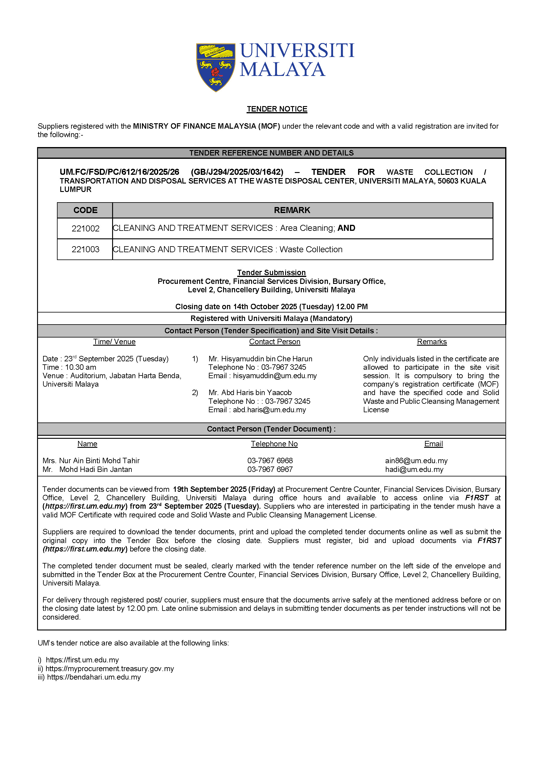UM.FC/FSD/PC/612/16/2025/26 (GB/J294/2025/03/1642) – TENDER FOR WASTE COLLECTION / TRANSPORTATION AND DISPOSAL SERVICES AT THE WASTE DISPOSAL CENTER, UNIVERSITI MALAYA, 50603 KUALA LUMPUR