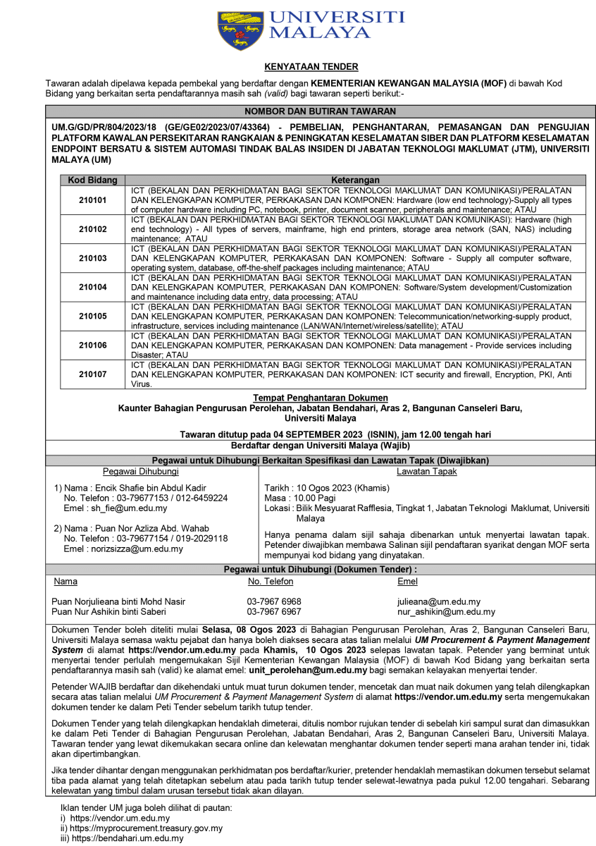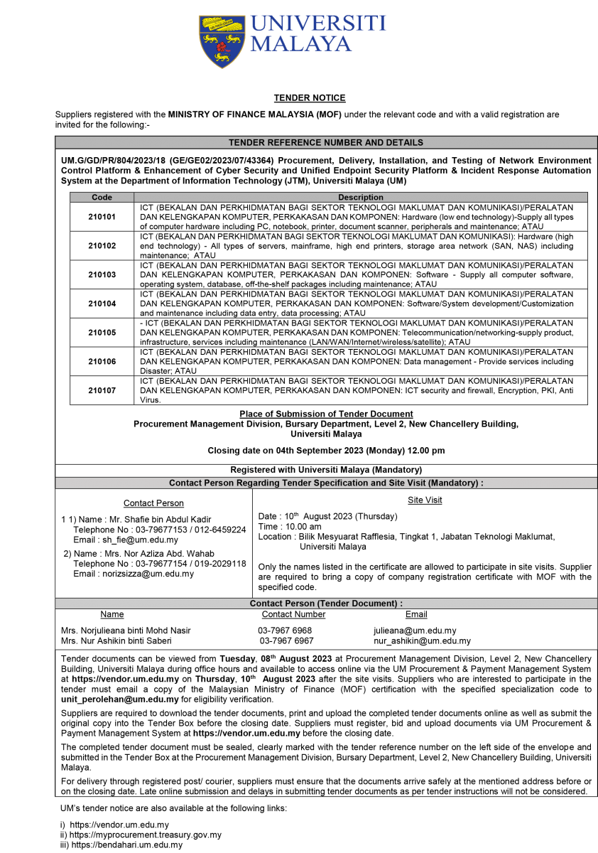 UM.G/GD/PR/804/2023/18 (GE/GE02/2023/07/43364) PROCUREMENT, DELIVERY, INSTALLATION, AND TESTING OF NETWORK ENVIRONMENT CONTROL PLATFORM & ENHANCEMENT OF CYBER SECURITY AND UNIFIED ENDPOINT SECURITY PLATFORM & INCIDENT RESPONSE AUTOMATION SYSTEM AT THE DEPARTMENT OF INFORMATION TECHNOLOGY (JTM), UNIVERSITI MALAYA (UM)