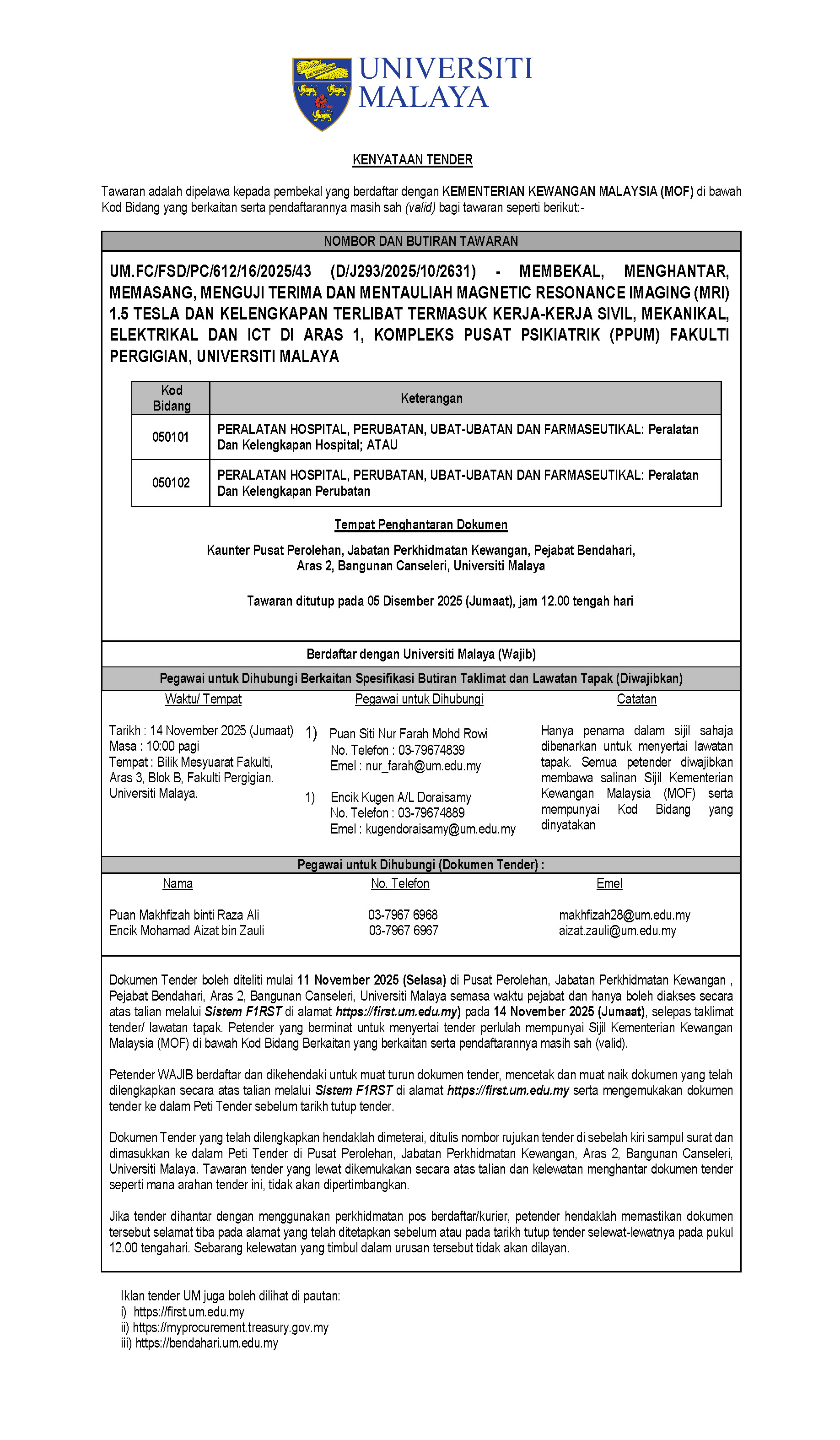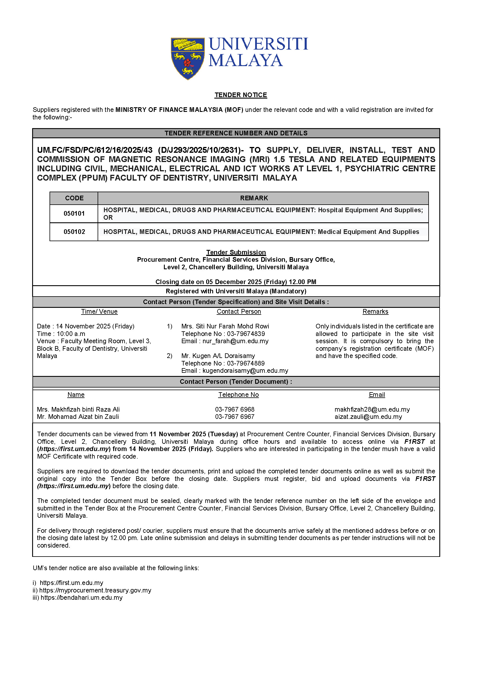 UM.FC/FSD/PC/612/16/2025/43 (D/J293/2025/10/2631)- TO SUPPLY, DELIVER, INSTALL, TEST AND COMMISSION OF MAGNETIC RESONANCE IMAGING (MRI) 1.5 TESLA AND RELATED EQUIPMENTS INCLUDING CIVIL, MECHANICAL, ELECTRICAL AND ICT WORKS AT LEVEL 1, PSYCHIATRIC CENTRE COMPLEX (PPUM) FACULTY OF DENTISTRY, UNIVERSITI MALAYA